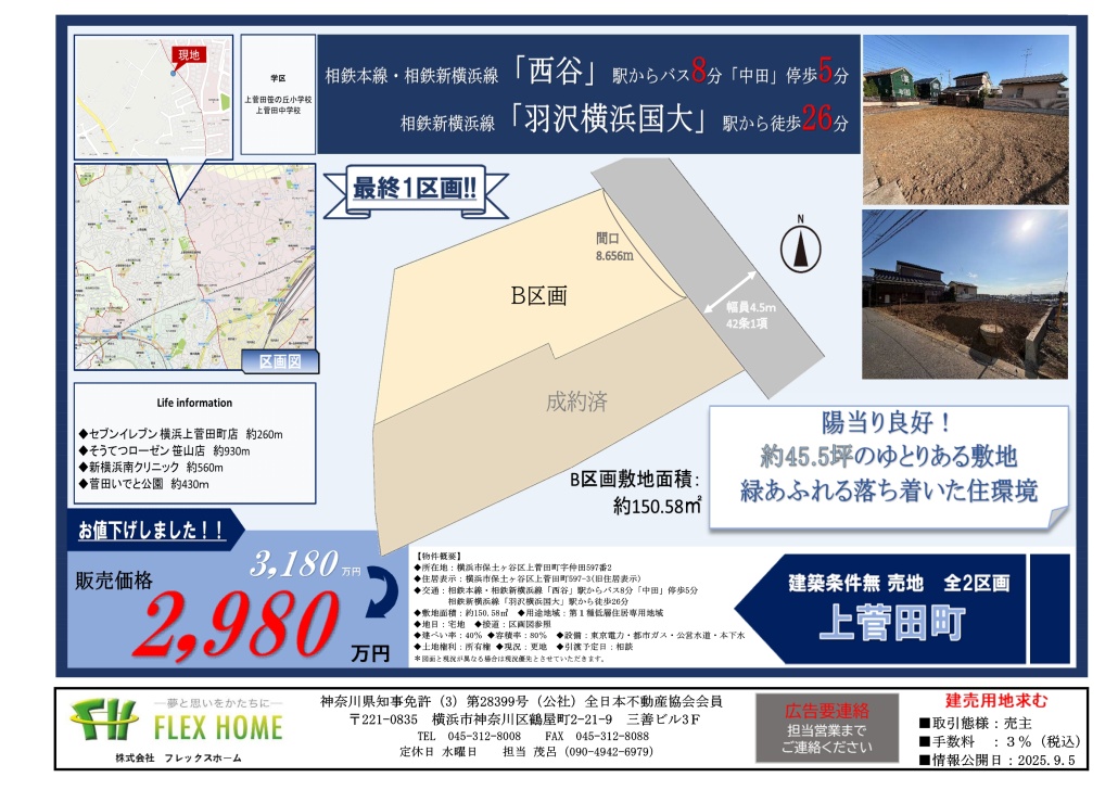 NEWS&INFORMATION 最新のニュースを更新しております READ MORE 2025.11.07 上菅田町(全2区画)B区画 お値下げしました! 2025.10.30 芹が谷3丁目(全1棟)堂々完成!値下げしました! 2025.10.16 初山2丁目(全1棟)公開しました! 2025.10.09 下鶴間(全1棟)公開しました! REALESTATE 販売物件 フレックスホームのプロジェクト物件シリーズ READ MORE SALESRESULTS 分譲実績 これまでに販売を行った分譲実績のご紹介 READ MORE FLEX'SADVANTAGE フレックスホームの強み 他社にはない5つの強みをご紹介いたします REALESTATEPURCHASE 不動産買取 自社にて高価&スピード買取いたします ABOUTTHEBUILDING フレックスホームの建物について EQUIPMENTSPEC. 建物設備・仕様 暮らしを彩る充実した建物設備 AFTERSERVICE アフターサービス 安心のサービスがございます HOUSEINSURANCE 住まいの保険 住まいに関する保険について INSPECTIONAGENCY 検査機関 検査状況をご確認いただけます COMPANYINFORMATION フレックスホームの企業情報です ABOUTCOMPANY 会社案内 フレックスホームの会社案内 CSRACTIVITIES CSR活動 活動内容を掲載しております RECRUITINFO. 採用情報 お問い合わせお待ちしております RECOMMENDREALESTATE フレックスホームおすすめの暮らしやすさを追求した物件シリーズです READ MORE 新築一戸建て 【4LDK】 横浜市港南区芹が谷3丁目 横浜市営地下鉄ブルーライン「上永谷」駅 徒歩21分 4,680万円(税込) 新築一戸建て 全2棟 【4LDK】 相模原市南区東林間7丁目 東急田園都市線「中央林間」駅 徒歩12分 5,680万円(税込) 新築一戸建て 全1棟 【3LDK】 川崎市宮前区初山2丁目 東急田園都市線「溝の口」駅 バス20分停歩3分 3,780万円(税込) 土地条件なし 【150.58㎡】 横浜市保土ケ谷区上菅田町 相鉄本線「西谷」駅 バス8分停歩5分 2,980万円 新築一戸建て 【4LDK】 大和市下鶴間 東急田園都市線「つきみ野」駅 徒歩12分 5,480万円(税込) READ MORE SALES RESULTS これまでにプロジェクトを行った分譲実績のご紹介です READ MORE SOLD OUT 新築一戸建て 全6棟 【4LDK】 川崎市宮前区有馬5丁目 東急田園都市線「鷺沼」駅 徒歩18分 SOLD OUT SOLD OUT 新築一戸建て 全2棟 【4LDK】 横浜市旭区さちが丘 相鉄本線「二俣川」駅 徒歩8分 SOLD OUT SOLD OUT 新築一戸建て 全3棟 【4LDK】 横浜市旭区本村町 相鉄本線「二俣川」駅 徒歩7分 SOLD OUT SOLD OUT 新築一戸建て 全2棟 【4LDK】 横浜市港南区日野2丁目 横浜市営地下鉄ブルーライン「港南中央」駅 徒歩12分 SOLD OUT SOLD OUT 新築一戸建て 全2棟 【4LDK】 横浜市金沢区町屋町 京急本線「金沢文庫」駅 徒歩19分 SOLD OUT SOLD OUT 新築一戸建て 全1棟 【3LDK】 横浜市港北区新吉田東4丁目 横浜市営地下鉄グリーンライン「高田」駅 徒歩14分 SOLD OUT READ MORE