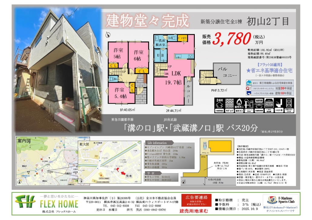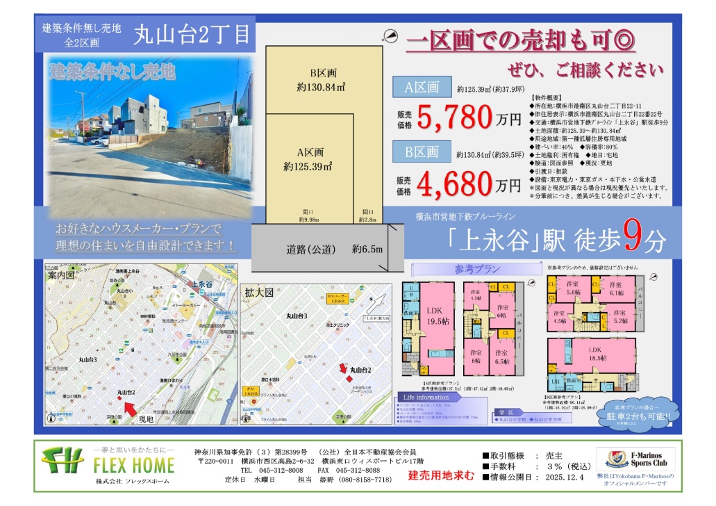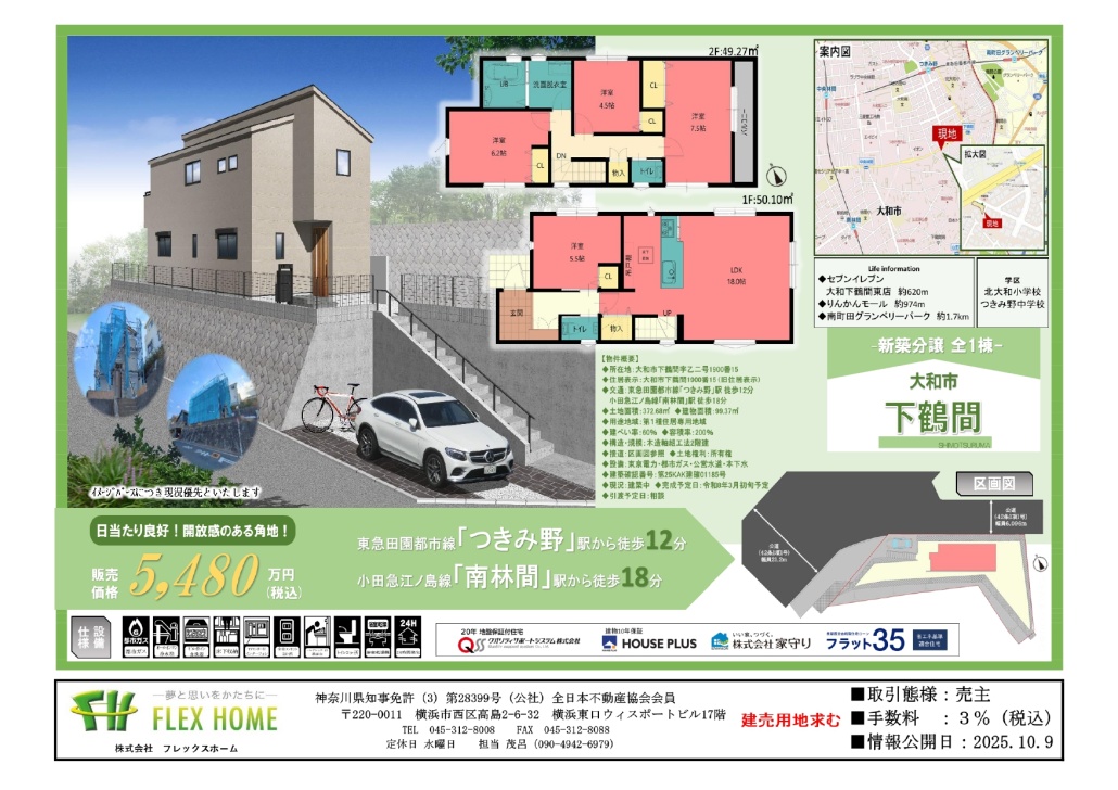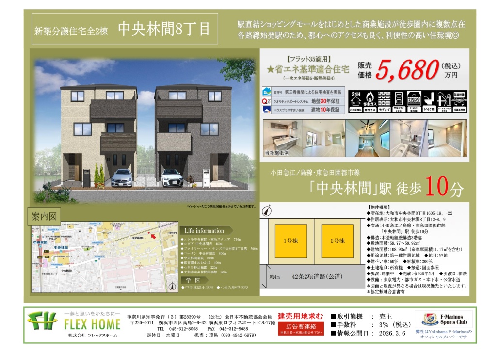 NEWS&INFORMATION 最新のニュースを更新しております READ MORE 2026.03.19 NEW ●事務所移転のお知らせ● 2026.03.17 NEW 神大寺2丁目Ⅱ(全2区画)おかげさまで全区画終了しました! 2026.03.13 笛田2丁目(全6区画)公開しました! 2026.03.10 馬絹4丁目Ⅱ(全1棟)終了しました! REALESTATE 販売物件 フレックスホームのプロジェクト物件シリーズ READ MORE SALESRESULTS 分譲実績 これまでに販売を行った分譲実績のご紹介 READ MORE FLEX'SADVANTAGE フレックスホームの強み 他社にはない5つの強みをご紹介いたします REALESTATEPURCHASE 不動産買取 自社にて高価&スピード買取いたします ABOUTTHEBUILDING フレックスホームの建物について EQUIPMENTSPEC. 建物設備・仕様 暮らしを彩る充実した建物設備 AFTERSERVICE アフターサービス 安心のサービスがございます HOUSEINSURANCE 住まいの保険 住まいに関する保険について INSPECTIONAGENCY 検査機関 検査状況をご確認いただけます COMPANYINFORMATION フレックスホームの企業情報です ABOUTCOMPANY 会社案内 フレックスホームの会社案内 CSRACTIVITIES CSR活動 活動内容を掲載しております RECRUITINFO. 採用情報 お問い合わせお待ちしております RECOMMENDREALESTATE フレックスホームおすすめの暮らしやすさを追求した物件シリーズです READ MORE 新築一戸建て 全2棟 【4LDK】 大和市中央林間8丁目 小田急江ノ島線「中央林間」駅 徒歩10分 5,680万円(税込) 新築一戸建て 全1棟 【3LDK】 川崎市宮前区初山2丁目 東急田園都市線「溝の口」駅 バス20分停歩3分 3,780万円(税込) 新築一戸建て 全2棟 【4LDK】 横浜市港北区新吉田東1丁目 横浜市営地下鉄グリーンライン「高田」駅 徒歩13分 6,080万円(税込) 新築一戸建て 全1棟 【4LDK】 大和市下鶴間 東急田園都市線「つきみ野」駅 徒歩12分 5,480万円(税込) 土地条件なし 全6区画 【160.29㎡〜】 鎌倉市笛田2丁目 湘南モノレール「湘南深沢」駅 徒歩5分 3,880万円〜 土地条件なし 全2区画 【125.39㎡〜】 横浜市港南区丸山台2丁目 横浜市営地下鉄ブルーライン「上永谷」駅 徒歩9分 4,680万円〜 READ MORE SALES RESULTS これまでにプロジェクトを行った分譲実績のご紹介です READ MORE SOLD OUT 新築一戸建て 全1棟 【4LDK】 川崎市宮前区馬絹4丁目 東急田園都市線「宮崎台」駅 徒歩15分 SOLD OUT SOLD OUT 新築一戸建て 【4LDK】 横浜市港南区芹が谷3丁目 横浜市営地下鉄ブルーライン「上永谷」駅 徒歩21分 SOLD OUT SOLD OUT 新築一戸建て 全2棟 【4LDK】 相模原市南区東林間7丁目 東急田園都市線「中央林間」駅 徒歩12分 SOLD OUT SOLD OUT 新築一戸建て 全6棟 【4LDK】 川崎市宮前区有馬5丁目 東急田園都市線「鷺沼」駅 徒歩18分 SOLD OUT SOLD OUT 新築一戸建て 全2棟 【4LDK】 横浜市旭区さちが丘 相鉄本線「二俣川」駅 徒歩8分 SOLD OUT SOLD OUT 新築一戸建て 全3棟 【4LDK】 横浜市旭区本村町 相鉄本線「二俣川」駅 徒歩7分 SOLD OUT READ MORE