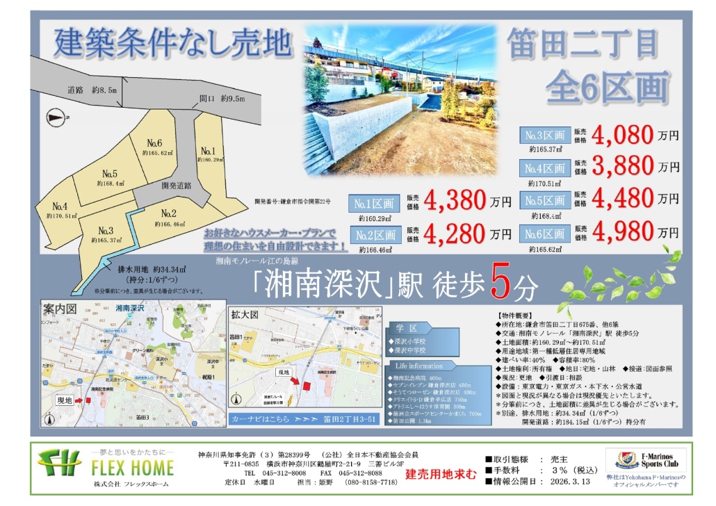 NEWS&INFORMATION 最新のニュースを更新しております READ MORE 2026.03.06 NEW 中央林間8丁目(全2棟)公開しました! 2026.03.01 新吉田東1丁目2号棟 終了しました!残り1棟です! 2026.02.20 高田西5丁目(全1区画)終了いたしました! 2026.02.19 馬絹4丁目Ⅱ(全1棟)公開しました! REALESTATE 販売物件 フレックスホームのプロジェクト物件シリーズ READ MORE SALESRESULTS 分譲実績 これまでに販売を行った分譲実績のご紹介 READ MORE FLEX'SADVANTAGE フレックスホームの強み 他社にはない5つの強みをご紹介いたします REALESTATEPURCHASE 不動産買取 自社にて高価&スピード買取いたします ABOUTTHEBUILDING フレックスホームの建物について EQUIPMENTSPEC. 建物設備・仕様 暮らしを彩る充実した建物設備 AFTERSERVICE アフターサービス 安心のサービスがございます HOUSEINSURANCE 住まいの保険 住まいに関する保険について INSPECTIONAGENCY 検査機関 検査状況をご確認いただけます COMPANYINFORMATION フレックスホームの企業情報です ABOUTCOMPANY 会社案内 フレックスホームの会社案内 CSRACTIVITIES CSR活動 活動内容を掲載しております RECRUITINFO. 採用情報 お問い合わせお待ちしております RECOMMENDREALESTATE フレックスホームおすすめの暮らしやすさを追求した物件シリーズです READ MORE 新築一戸建て 全1棟 【4LDK】 大和市下鶴間 東急田園都市線「つきみ野」駅 徒歩12分 5,480万円(税込) 新築一戸建て 全2棟 【4LDK】 大和市中央林間8丁目 小田急江ノ島線「中央林間」駅 徒歩10分 5,680万円(税込) 新築一戸建て 全1棟 【3LDK】 川崎市宮前区初山2丁目 東急田園都市線「溝の口」駅 バス20分停歩3分 3,780万円(税込) 新築一戸建て 全2棟 【4LDK】 横浜市港北区新吉田東1丁目 横浜市営地下鉄グリーンライン「高田」駅 徒歩13分 6,080万円(税込) 売地 全2区画 【101.29㎡〜】 横浜市神奈川区神大寺2丁目 横浜市営地下鉄ブルーライン「片倉町」駅 徒歩9分 3,580万円〜 土地条件なし 全2区画 【125.39㎡〜】 横浜市港南区丸山台2丁目 横浜市営地下鉄ブルーライン「上永谷」駅 徒歩9分 4,680万円〜 READ MORE SALES RESULTS これまでにプロジェクトを行った分譲実績のご紹介です READ MORE SOLD OUT 新築一戸建て 全1棟 【4LDK】 川崎市宮前区馬絹4丁目 東急田園都市線「宮崎台」駅 徒歩15分 SOLD OUT SOLD OUT 新築一戸建て 【4LDK】 横浜市港南区芹が谷3丁目 横浜市営地下鉄ブルーライン「上永谷」駅 徒歩21分 SOLD OUT SOLD OUT 新築一戸建て 全2棟 【4LDK】 相模原市南区東林間7丁目 東急田園都市線「中央林間」駅 徒歩12分 SOLD OUT SOLD OUT 新築一戸建て 全6棟 【4LDK】 川崎市宮前区有馬5丁目 東急田園都市線「鷺沼」駅 徒歩18分 SOLD OUT SOLD OUT 新築一戸建て 全2棟 【4LDK】 横浜市旭区さちが丘 相鉄本線「二俣川」駅 徒歩8分 SOLD OUT SOLD OUT 新築一戸建て 全3棟 【4LDK】 横浜市旭区本村町 相鉄本線「二俣川」駅 徒歩7分 SOLD OUT READ MORE