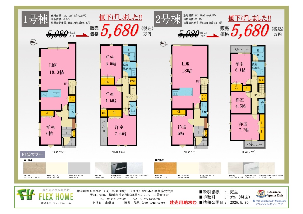 今回販売 | 2棟 | 土地面積 | 102.65㎡〜106.70㎡ |